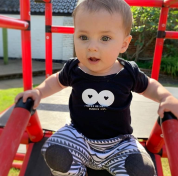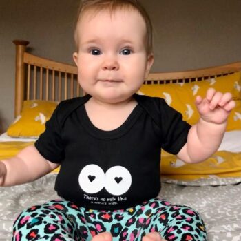 Baby vests are available in black and white colourways in sizes 0-3 months, 3-6 months & 6-12 months. Toddler tees available for 1yr+.